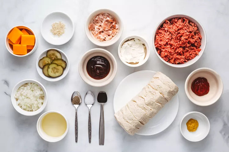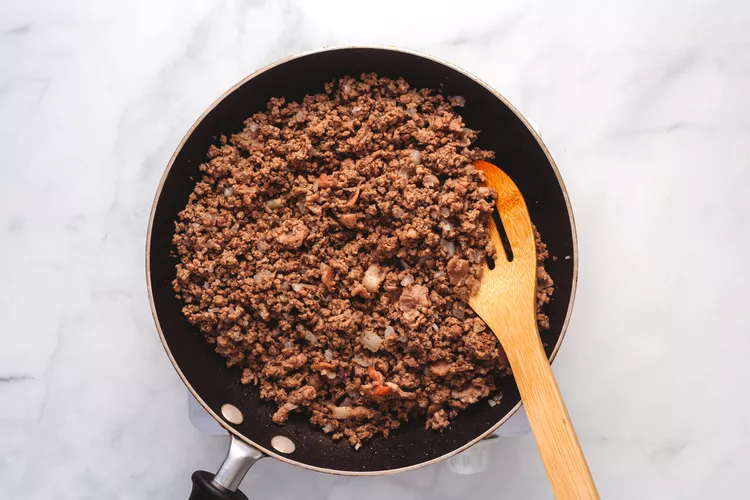 ဒယ်အိုးကြီးတစ်ခုမှာ 375 F ဖြင့် မီးဖိုကိုအပူပေးကာ နုပ်နုပ်စဥ်းထားတဲ့အမဲသား၊ ဘေကွန်နဲ့ ကြက်သွန်နီတို့ကို တည်ထားပါ။ ဆား၊ ငရုတ်ကောင်းတို့နဲ့ ရောနယ်ပါ။ ပိုနေတဲ့ အဆီတွေကို ဖယ်ထုတ်ပါ။ Cheddar Cheese၊ ketchup ၊ Barbecue Sauce ၊ မုန်ညင်းနဲ့ Worcestershire ငံပြာရည်ထည့်ပါ။ Cream Cheese အရည်ပျော်တဲ့အထိ မီးအေးအေးနဲ့ မွှေပေးပါ။