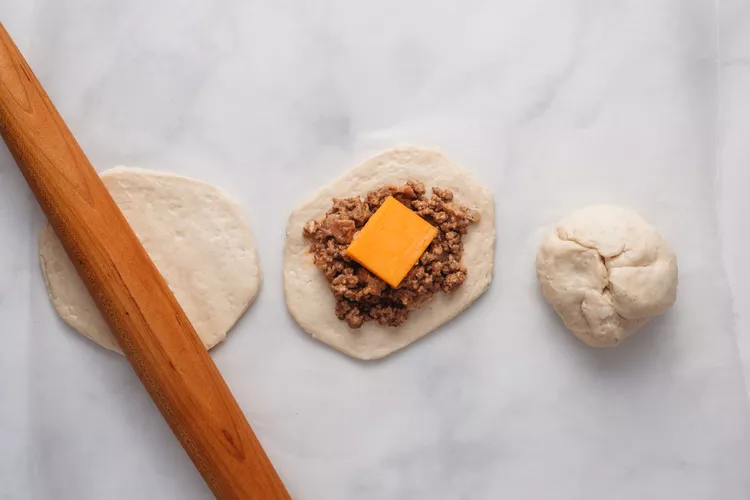 Pillsbury Biscuits ကို ပါးပါးလေးဖြစ်အောင် လှိမ့်လိုက်ပါ ။ အမဲသားအရောအနှောကို စားပွဲတင်ဇွန်း 2 ဇွန်း ထည့်ပြီး Cheddar Cheese 1 တုံး ထည့်ပါ။ အမဲသား/ဒိန်ခဲ ကိုလုံအောင် အနားသတ်များကို တင်းတင်းကျပ်ကျပ် အုပ်လိုက်ပါ။