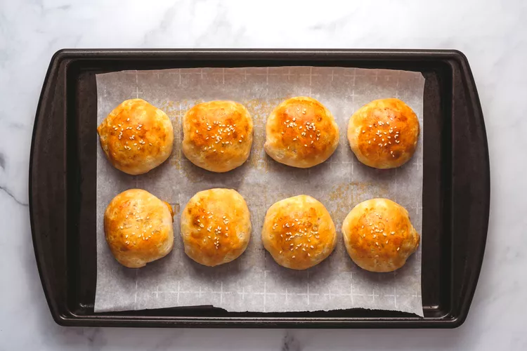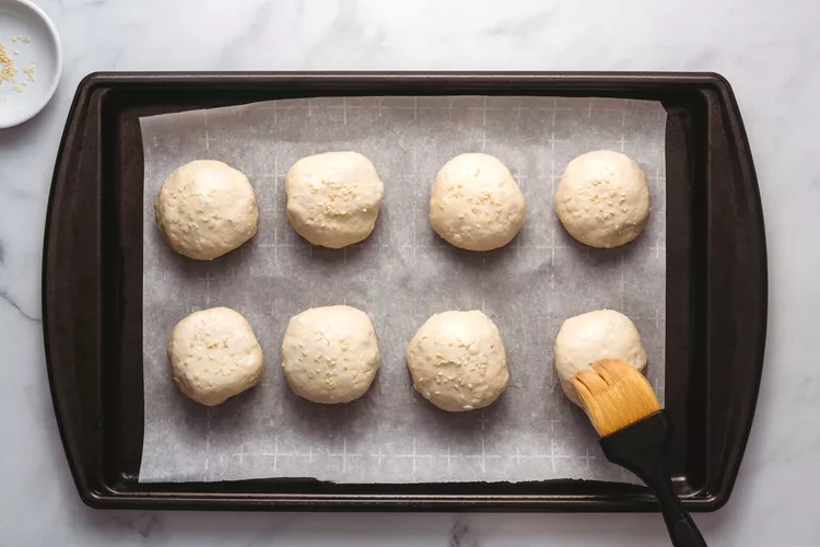 မုန့်လုံးတွေကို မုန့်ဖုတ်ဗန်းပေါ်မှာတင်းပြီး နှမ်းဖြူးလိုက်ပါ။ အပေါ်ကနေ ကြက်ဥအကာကို သုတ်ပေးပါ။