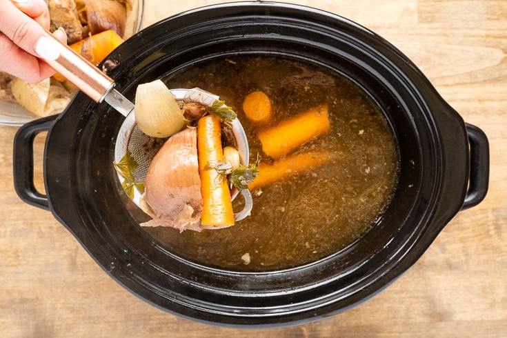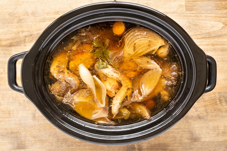 အသီးအရွက်များထည့်ပါ။ ရေထည့်ပါ။ဆူအောင်တည်ထားပြီး အပူကိုလျှော့ပြီး မီးအေးအေးနဲ့တည်ထားပါ။ အဆီကျအောင် 24-48 နာရီ နှပ်ထားပါ။ အချိန်ကြာကြာတည်တာက ပါဝင်ပစ္စည်းတွေရဲ့အရသာကို တိုးစေပါတယ်။