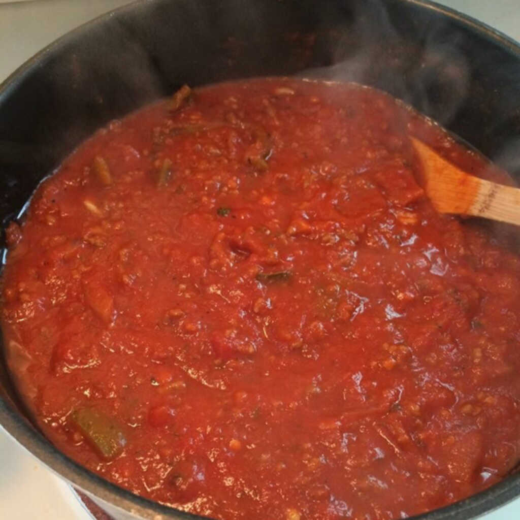 ခရမ်းချဉ်သီးဆော့စ်ကိုထည့်ပြီး ဆူအောင်တည်ထားပြီး ဆူလာရင် ရေနဲ့ ခရင်မ်တို့ကို ထည့်ပြီး ဆူအောင်တည်ထားပါ။