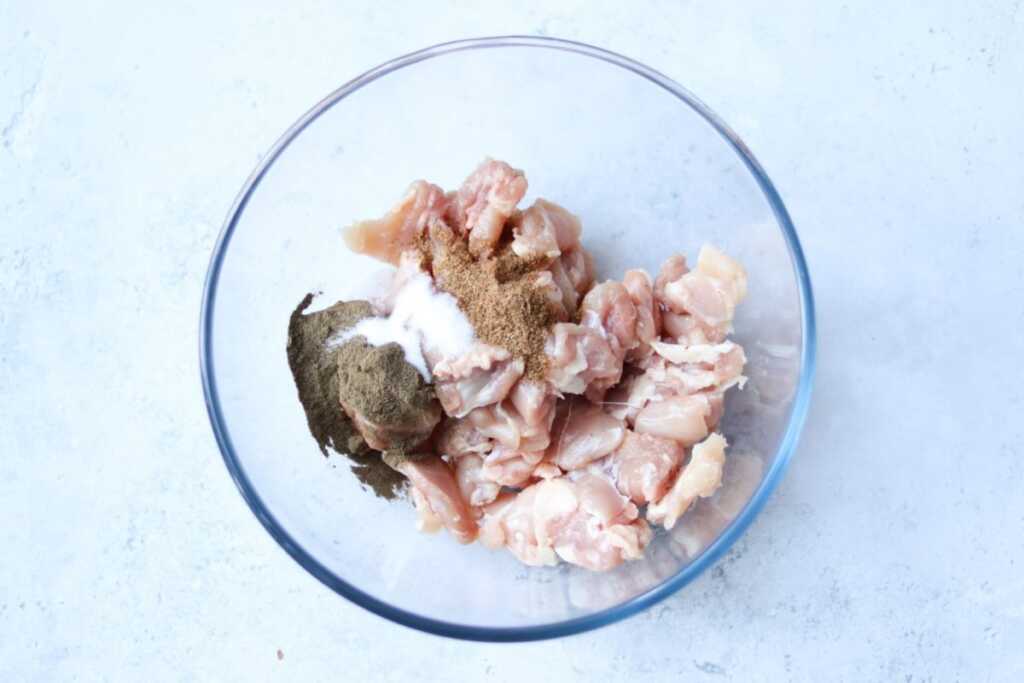 ပန်းကန်လုံးကြီးတစ်လုံးထဲမှာ ကြက်သားကို ဆား၊ ငရုတ်ကောင်းမှုန့် လက်ဖက်ရည်ဇွန်း ၁ ဇွန်း၊ နနွင်း လက်ဖက်ရည်ဇွန်း ၁ ဇွန်းတို့ကို ရောနယ်ပါ။
