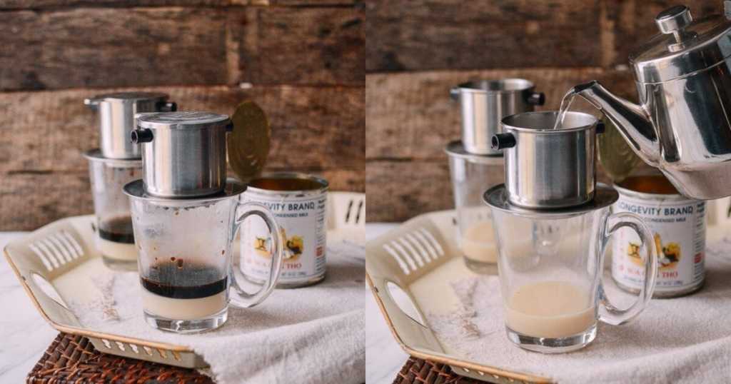 - ပွက်ပွက်ဆူနေသောရေကို ဇကာထဲ လောင်းပြီး 5 စက္ကန့်လောက်စောင့်ပါ။ ပြီးမှ ကျန်တဲ့ရေတွေကို ဇကာထဲ ဖြည်းဖြည်းချင်း လောင်းထည့်ပါ။ ကော်ဖီဖျော်ပြီးအောင် 5 မိနစ်လောက်စောင့်ပါ။ ပြီးရင်တော့ ဇကာကိုဖယ်ပြီး နို့ဆီနဲ့ ရောမွှေပေးပါ။ ဒါဆိုရင်တော့ ချိုချိုမွှေးမွှေးလေး ဗီယက်နမ်ကော်ဖီလေး သောက်လို့ရပါပြီ။