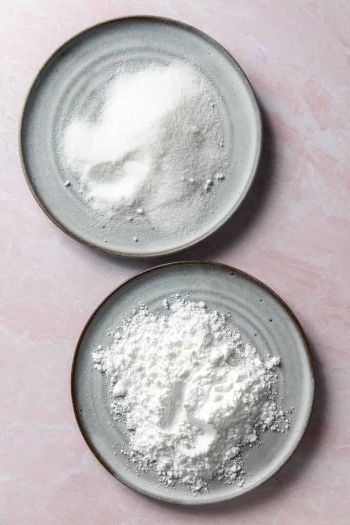 မီးဖိုကို 350°F ဖြင့် ကြိုတင်အပူပေးထားပါ။ Powdered Sugar နဲ့ Granulated Sugar ကို ပန်းကန်လုံး နှစ်လုံးနဲ့ ထည့်ထားပါ။ မုန့်ဖုတ်စက္ကူကို ဖုန့်ဖုတ်ဗန်းမှာခင်းထားပါ။