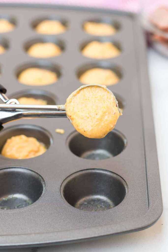 - မွှေထားတဲ့မုန့်အနှစ်တွေကို Muffin ခွက်တစ်ခုစီတွင် ထည့်ပြီး Muffin တစ်ခုစီရဲ့အလယ်မှာ ဟော့ဒေါ့တစ်ပိုင်းကို ညင်သာစွာ ဖိပေးပါ။