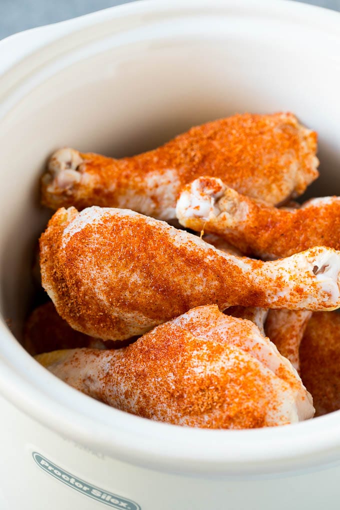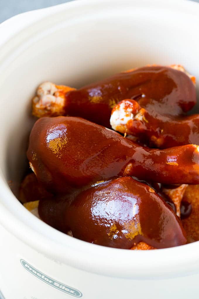 - အရင်ဆုံး Slow Cooker ကို Cooking Spray ဖြန်းပေးပါ။ ကြက်ပေါင်ကို BBQ အမှုန့်နဲ့နယ်ပြီးရင် Slow Cooker ထဲကို စီထည့်လိုက်ပါ။ အပေါ်ကနေ BBQ Sauce ကို ဆမ်းပေးပါ။