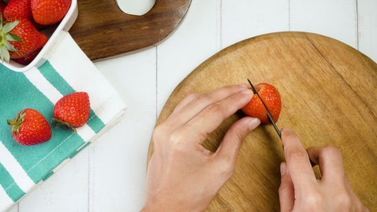မီးဖိုကို 350 ဒီဂရီ ဖာရင်ဟိုက်နဲ့ ကြိုတင်အပူပေးထားပါ။ စတော်ဘယ်ရီသီးကို ပင်စည်ပိုင်း ဖြတ်ပြီး သန့်စင်ထားပါ။