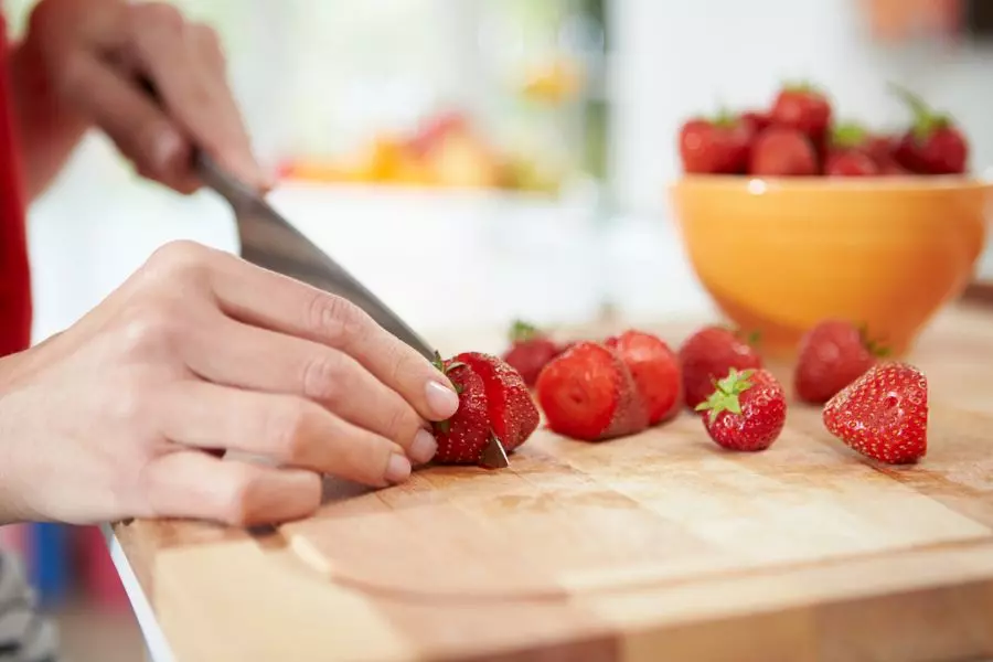 စတော်ဘယ်ရီသီးများကို ရေဆေးပြီး လှီးထားပါ။