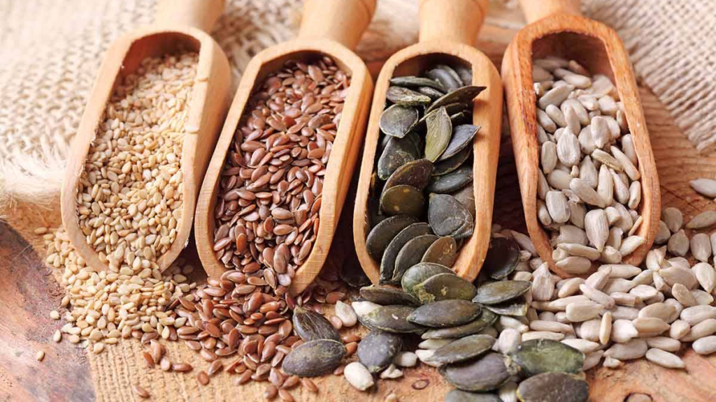 Chia စေ့၊ နှမ်းကြတ်စေ့ နဲ့ လျှော်စေ့တို့မှာ ဆံပင်အတွက်လိုအပ်တဲ့ ဓာတ်တွေ မြင့်မားစွာပါဝင်ပြီး ဆံပင်ကြီးထွားမှုကို အထောက်အကူဖြစ်စေတဲ့ အမျှင်ဓာတ်နဲ့ ကျန်းမာတဲ့အဆီတွေ များစွာပါဝင်ပါတယ်။